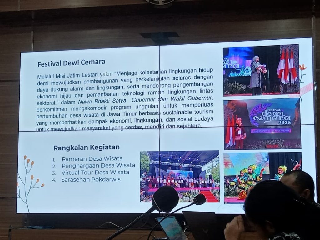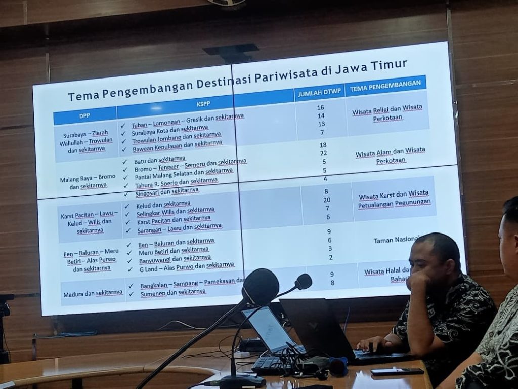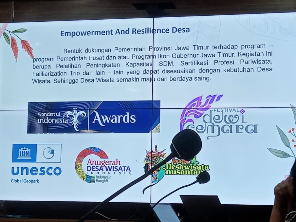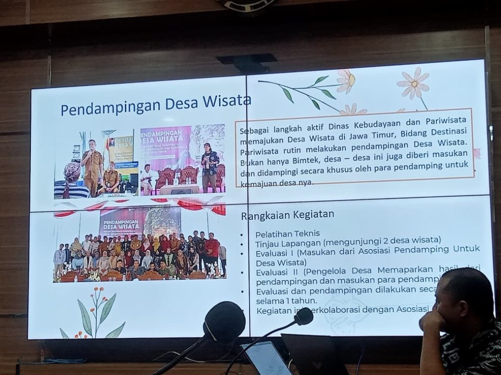 Surabaya. Pada pertemuan Audiensi dan Sharing Knowledge pada Program Benchmarking dan Replikasi Model Pengelolaan Desa Wisata Berprestasi sebagai Upaya Penguatan Kapasitas Pokdarwis Kalimantan Selatan ke Provinsi Jawa Timur dengan Dinas Kebudayaan dan Pariwisata Provinsi Jawa Timur, Kepala Bidang Destinasi Disbudpar Prov. Jatim banyak menceritakan langkah-langkah strategis mereka.