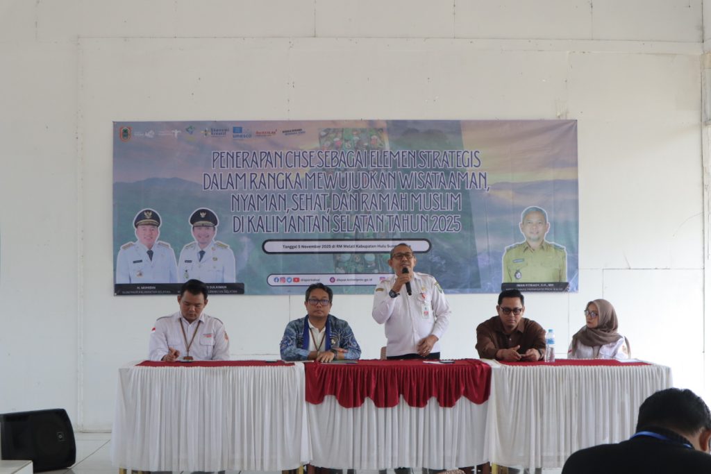 Amuntai. Kepala Dinas Pariwisata Provinsi Kalimantan Selatan, Iwan Fitriady, S.H.,M.H. membuka secara resmi Workshop Penerapan CHSE sebagai Elemen Strategis dalam Rangka Mewujudkan Wisata Aman, Nyaman, Sehat, dan Ramah Muslim di Kalimantan Selatan Tahun 2025 melalui Kepala Bidang Pengembangan Destinasi, Gusti Muhammad Yosalvina Yovani, S.Sos.,M.Si. yang digelar di Kabupaten Hulu Sungai Utara pada Rabu 5 November 2025.