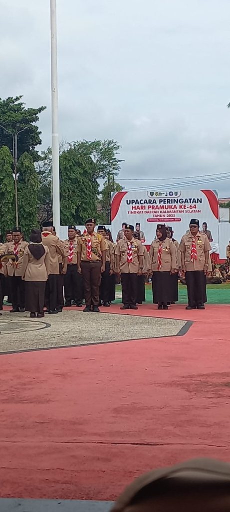 Tabalong. Plt. Kepala Dinas Pariwisata Provinsi Kalimantan Selatan, Muhammad Syarifuddin, M.Pd, mengikuti Apel Besar Peringatan Hari Pramuka ke-64 Tingkat Provinsi Kalimantan Selatan yang digelar di Halaman Pendopo Bersinar Pembataan, Tabalong, pada Rabu 10 September 2025 dengan diwakili oleh Mugeni, S.Sos, Kabid Pengembangan Destinasi dan M. Andriyadi, Kasi Pengembangan SDM Parekraf.