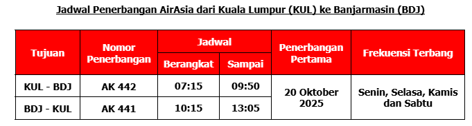 AirAsia akan melayani penerbangan Banjarmasin (BDJ) – Kuala Lumpur (KUL) sebanyak 4 (empat) hari dalam satu minggu, yaitu :